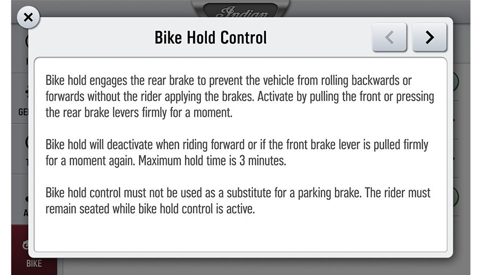 Le contrôle de l'immobilisation de la moto est un dispositif utilisé lorsque les motards sont à l'arrêt sur une pente ou un déclin. Le système fonctionne en appliquant une pression sur les freins pour empêcher la moto d'avancer ou reculer. Le contrôle de l'arrêt de la moto peut être activé en tirant fermement sur le levier de frein avant ou en appuyant fermement sur la pédale de frein arrière. Les notifications d'état pour savoir si le système Bike Hold Control est disponible et actif sont affichées sur l'écran 7 pouces alimenté par RIDE COMMAND. Le contrôle de l'arrêt de la moto fonctionne sur tous les rapports, y compris le point mort. L'immobilisation se désactive lorsque :